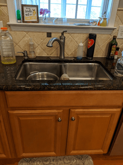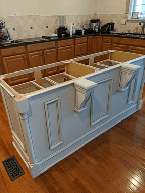 Modifying our existing cabinet and installing a farmhouse sink with a short apron front was our initial plan, but since we were already ordering a new cabinet to replace the desk, my husband had the idea to order a new cabinet for the sink as well so we could have a full size sink. Yippee! We are so glad we did- when we removed the old sink cabinet, it almost fell apart! A few years ago, we had a water leak from the dishwasher and the water had caused more damage than we thought. Had we installed the 150lb sink it would have been bad news!
