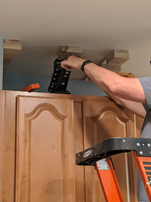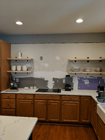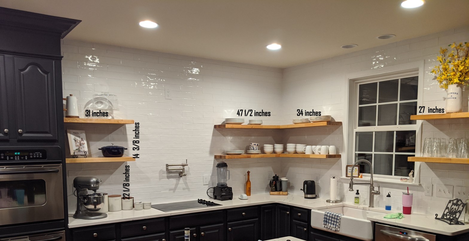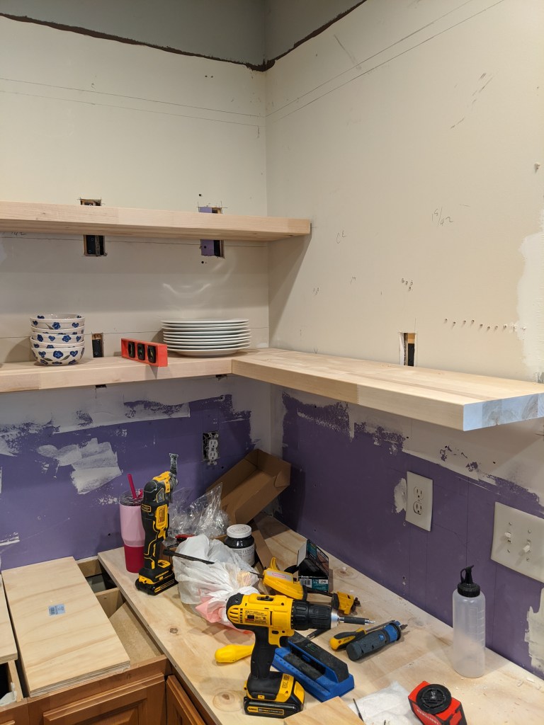 Step 3: Install supporting brackets for floating shelves (*Amazon link below*) We decided our existing backsplash had to go so the hubs was able to countersink the supporting brackets into studs, then place drywall over, and finally add the tile counter-to-ceiling backsplash.