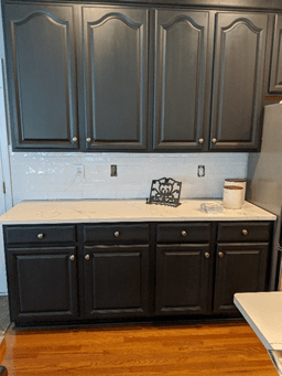 While we waited for the quartz to be templated and installed, I began the first phase of cabinet painting (6 phases in all) A whole other post needs to be dedicated to that large but extremely gratifying process. Seriously ya’ll, if I can paint my cabinets, anyone can paint their cabinets and you can save a boatload of money. We received a quote for $4500 and we spent under $500- including the new knobs! Woohoo!
