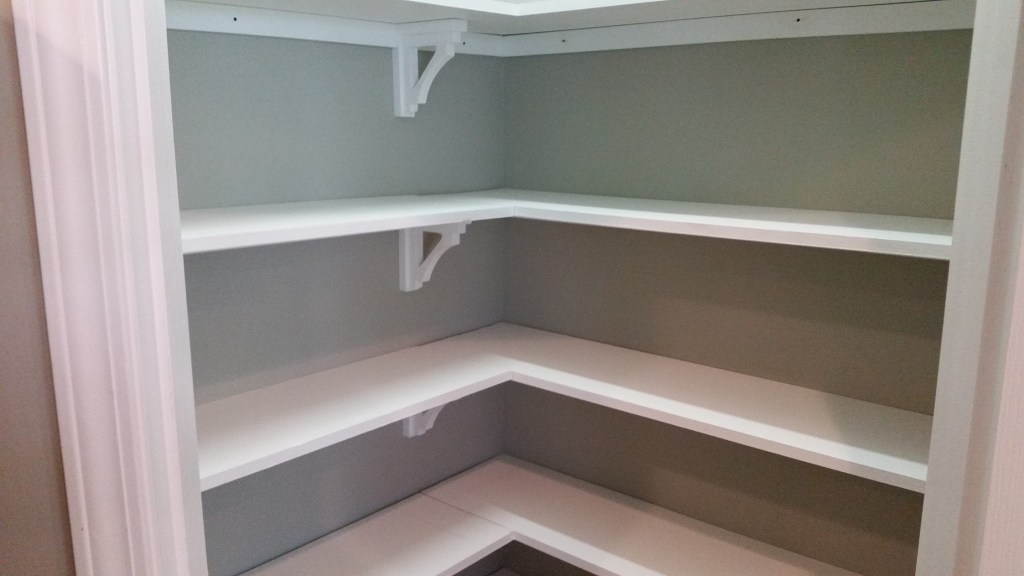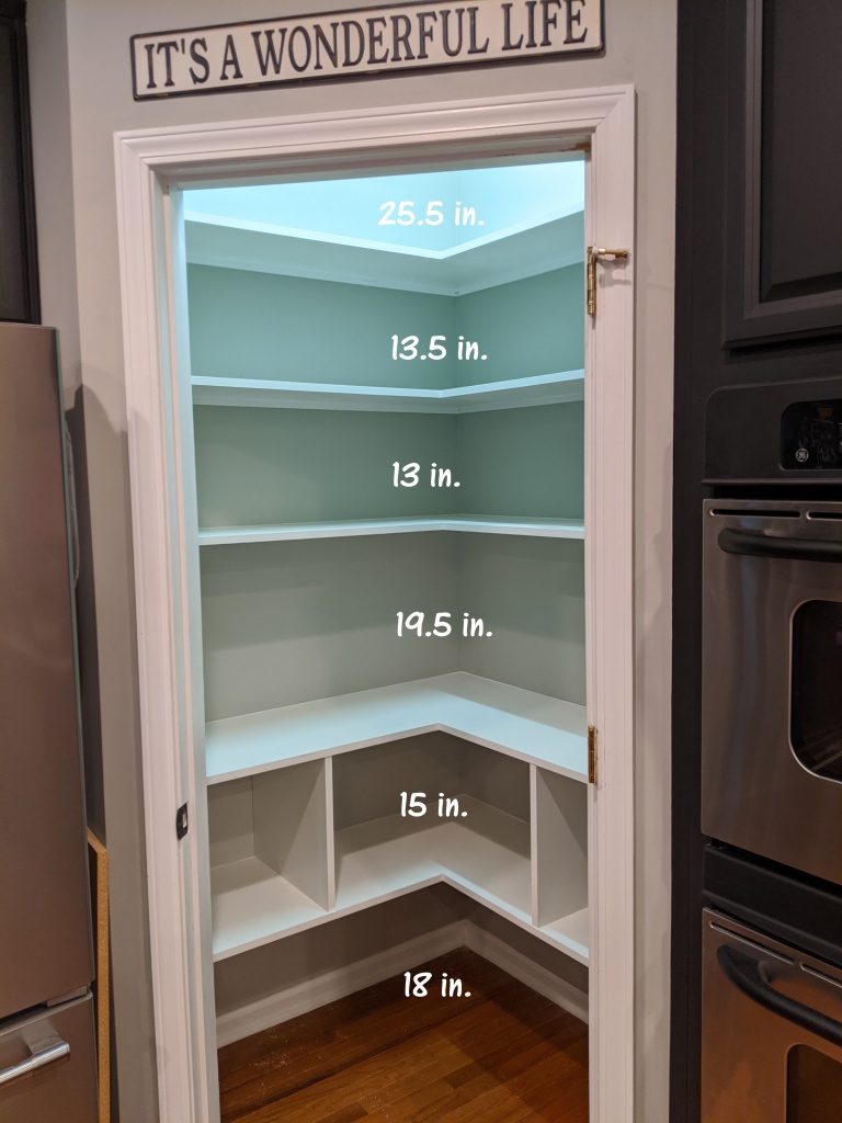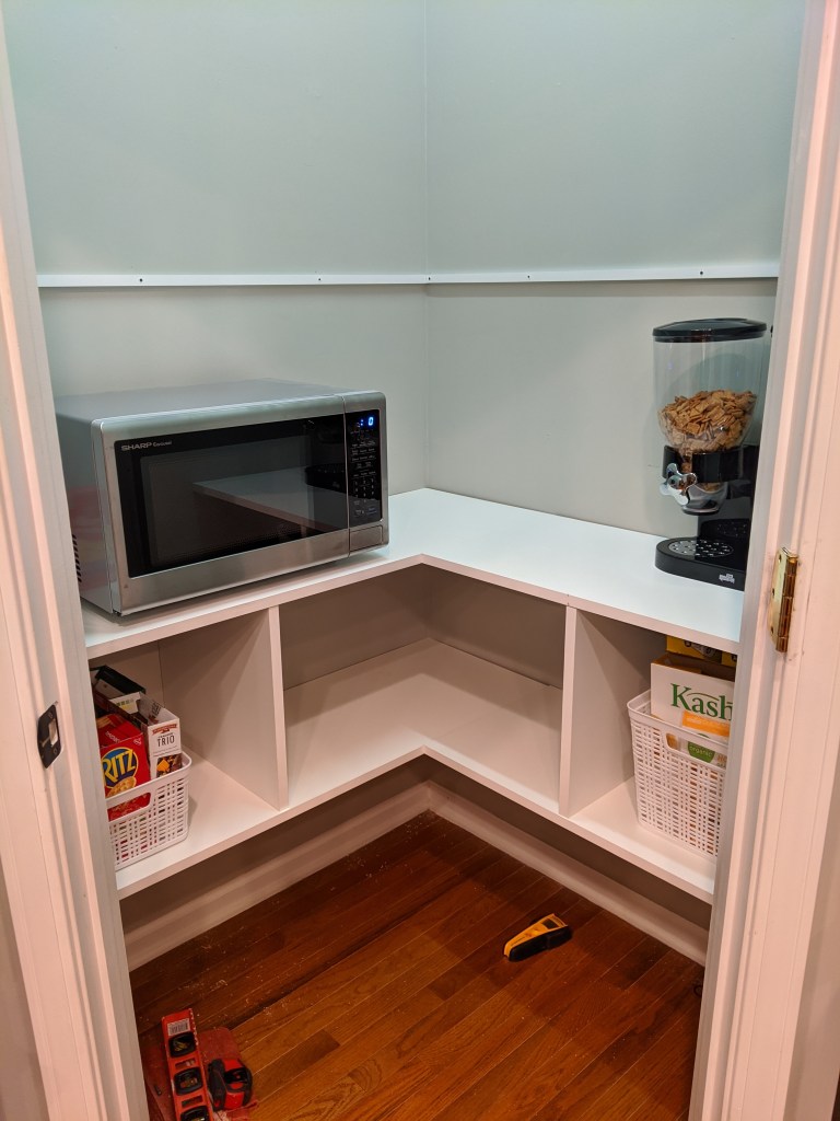 We (by “we” I mean my husband) created the “counter space” to accommodate the microwave by making the shelf wider- 16 inches from the wall. All the other shelves were 12 inches in width.