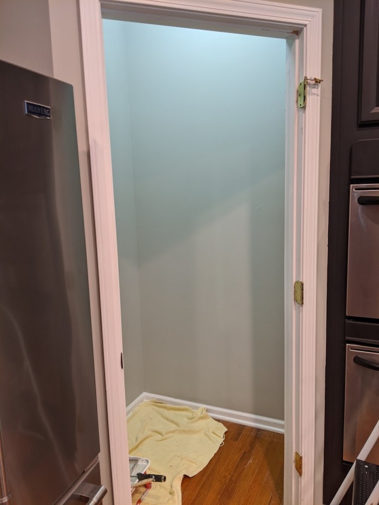 Oh, and I didn’t want to be able to see into the pantry through the glass (I know, I know after all that hard work… Did I mention my husband is a very patient man?) I found looking glass spray and by using vinegar and a paper towel, I managed to achieve the distressed look that I was going for- Woohoo!