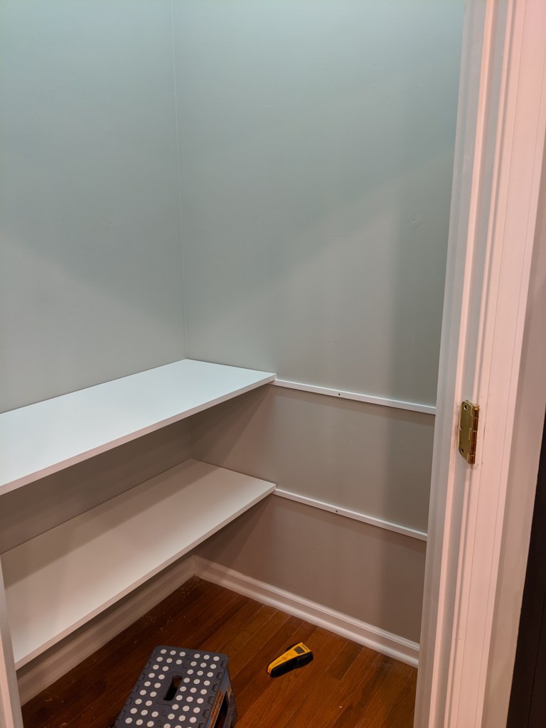 After removing the previous shelving and brackets, we had A LOT of holes to patch! It looked like a woodpecker had gotten trapped inside there were so many holes- yikes! I don’t have a picture of that hot mess.