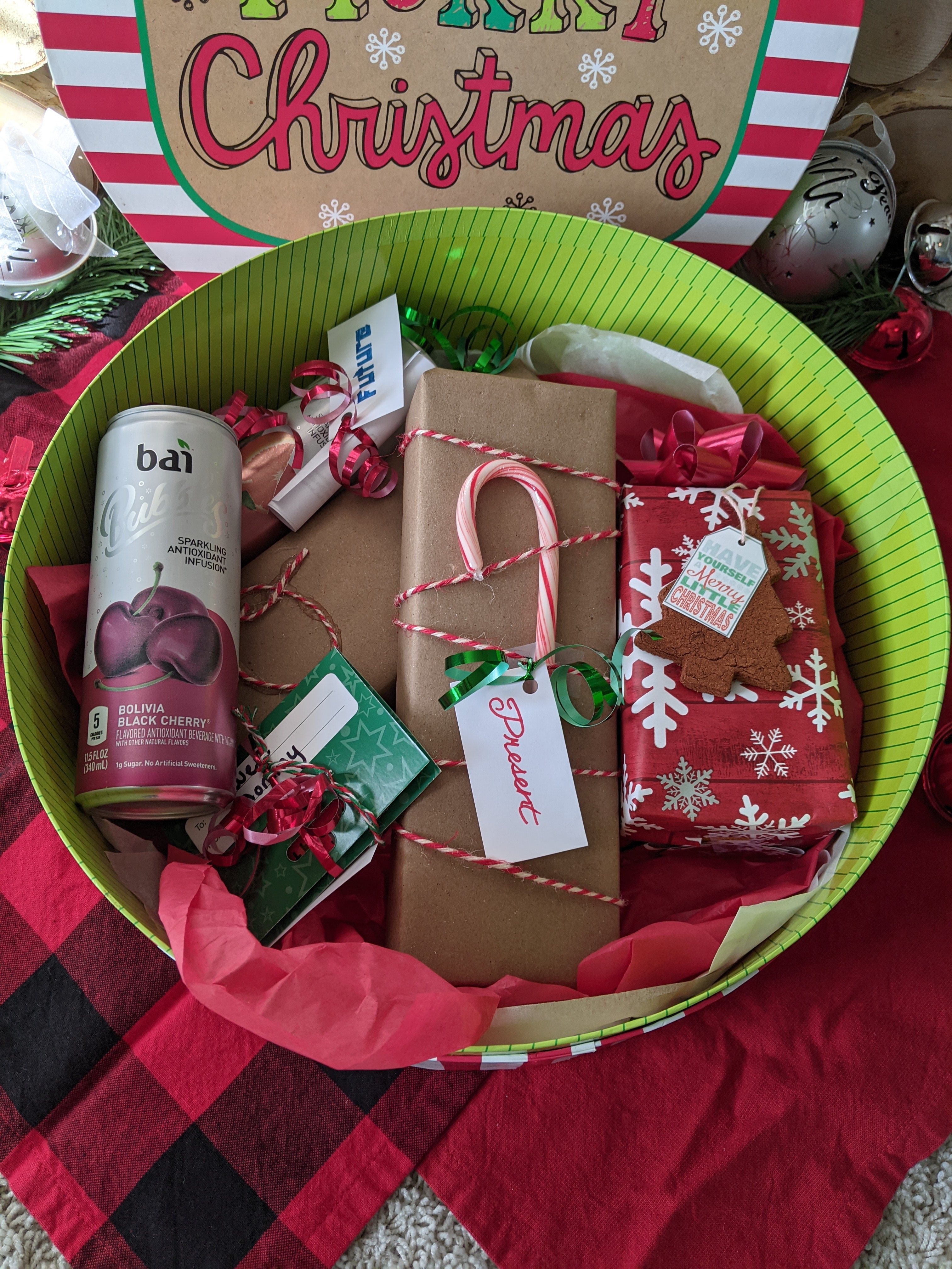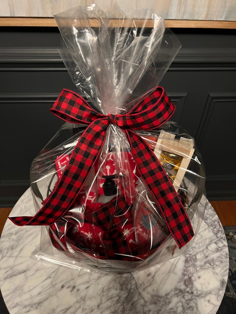 This gift basket is for my Mom. I didn’t pick a specific theme for this one. I included items I knew she would love and could enjoy in her new home. The red door ornament is from Target but I personalized it by adding “Our New Home” (I used my Cricut Joy! (I just love that little machine) I found a neat little way to fold a Christmas dish towel on Pinterest and put in some peppermint scented Mrs. Meyer’s soap.