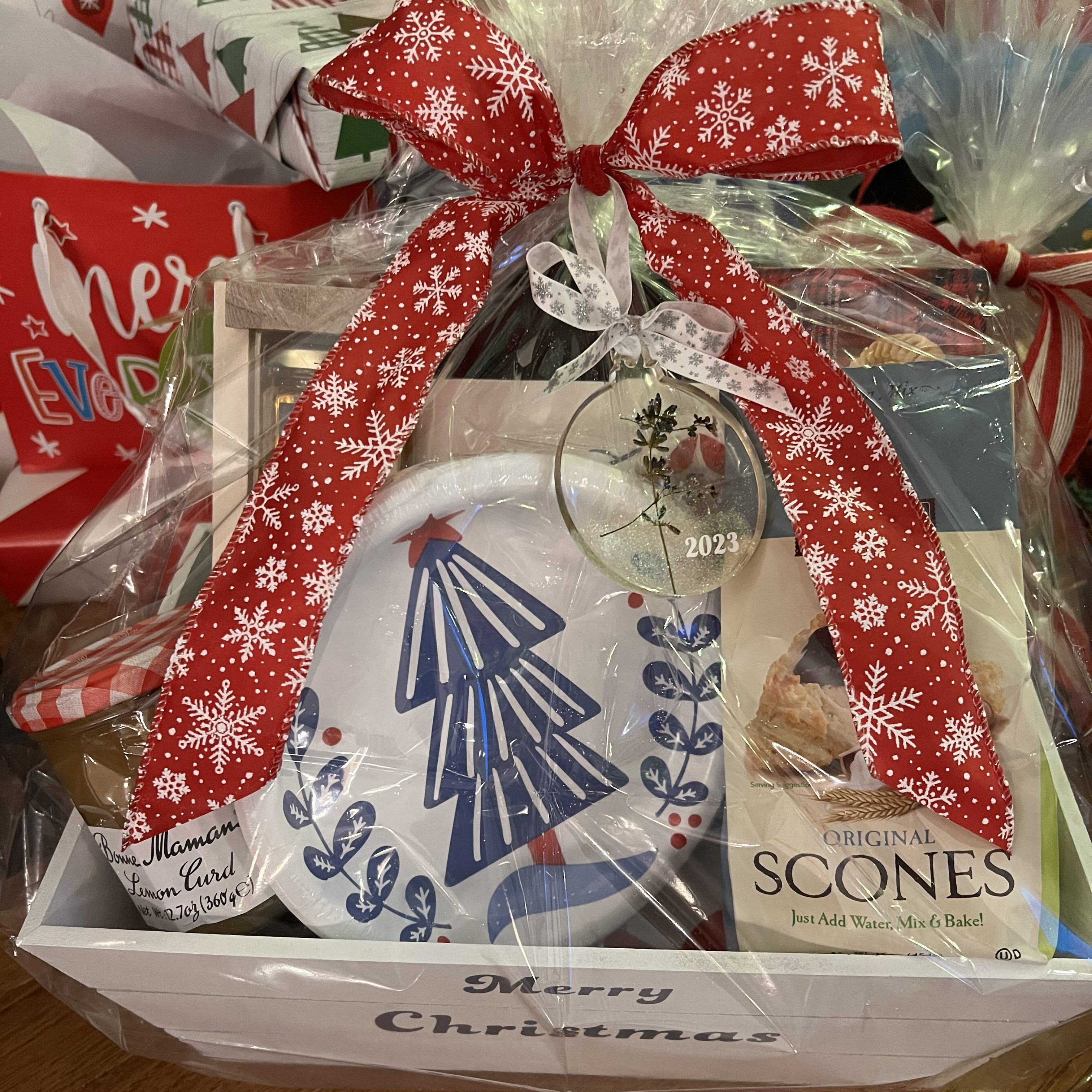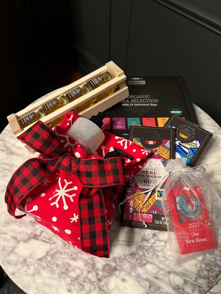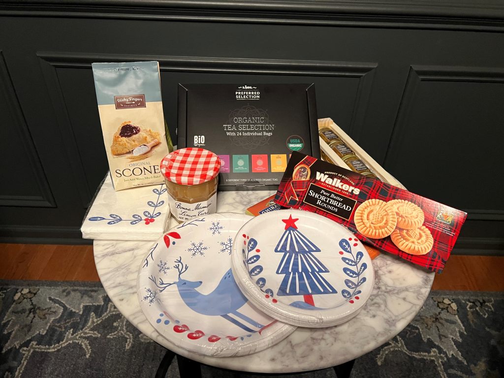 Our amazing friends happen to live just across the street- how blessed are we? Here are the items I found for their basket. I chose a theme, “Tea time” but I needed to make it PERSONAL! Her favorite color is blue. I was so excited to find these blue Christmas plates at Target. Also, I knew her parents were visiting from Holland and they enjoy having tea together. These cute little honey jars and tea sampler are from Lidl! I thought they may also enjoy some scones and I had great intentions of making some homemade, but when I spotted this mix at World Market I was convinced that it was a sign I didn’t need to add to my long list of Christmas baking. Lastly, I added some Bonne Maman lemon curd and a chocolate bar. The wooden basket was from the getcha area (that’s what I call it) in the front area of Target. I wrapped the entire basket in a large clear plastic gift bag from Michaels and added the finishing touch- a bow and a pressed flower resin ornament my middle son and I made. All in, this gift was $45!